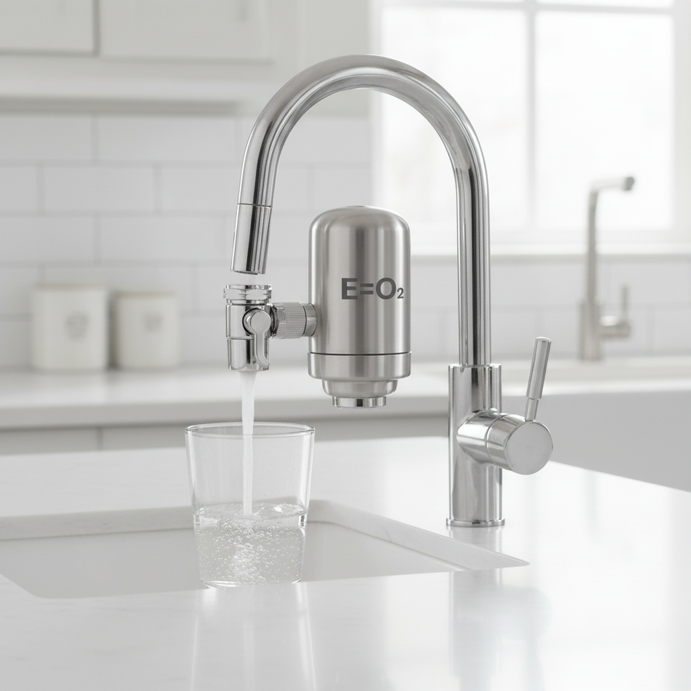 Avec le filtre E=O₂ au charbon actif, transformez chaque goutte en eau plus pure, plus saine et délicieuse directement au robinet, en moins d’1 minute.